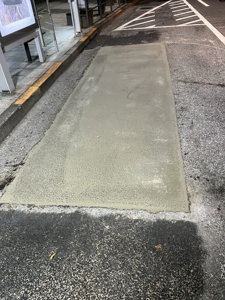千代田区有楽町のバス停の轍補修工事 路面を切削後、半たわみ性アスファルトで舗装し、半たわみ性舗装用セメントミルクを流し込みました。...